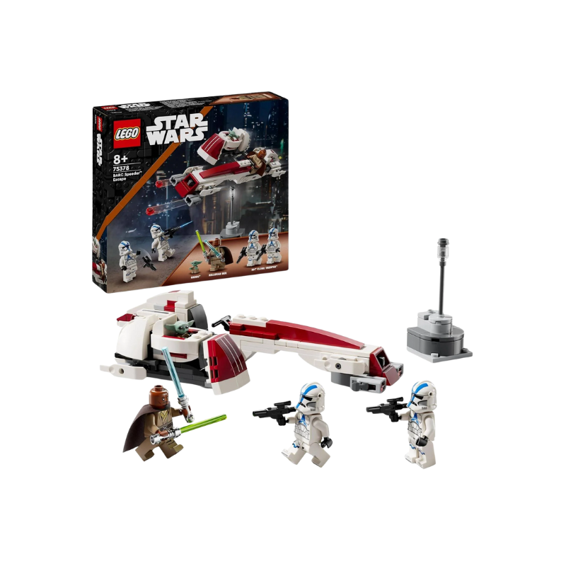 Le set LEGO Star Wars L'évasion en Speeder BARC permet de revivre une scène culte de Star Wars: The Mandalorian. Il comprend un speeder BARC avec un side-car détachable, équipé de fusils à tenons et d'un cockpit pour minifigurine.