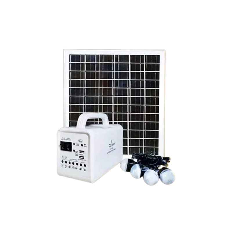 Il est équipé d’un panneau solaire polycristallin, d’une unité centrale avec batterie rechargeable intégrée, de quatre ampoules LED à faible consommation, ainsi que de ports USB permettant de recharger téléphones, radios, ou petits appareils électroniques.